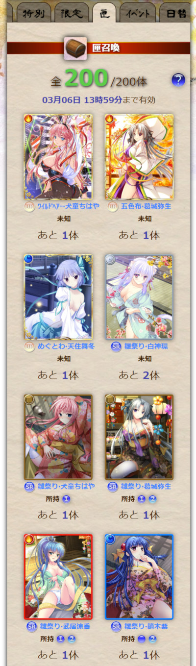 特別召喚、匣召喚SR:雛祭りシリーズ(SR+に進化すると脱衣アイコンが出現)